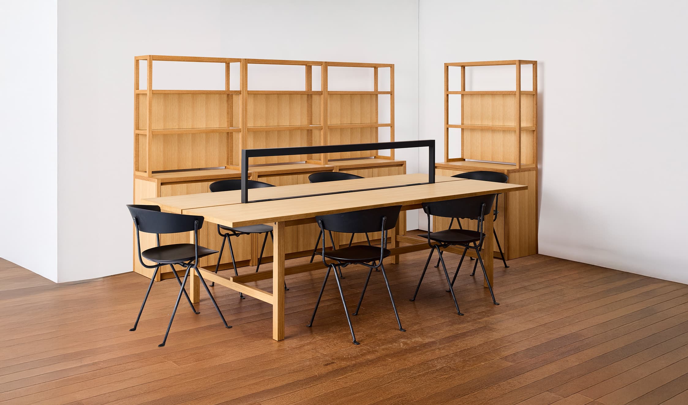 三上⼯作所のオフィス家具は、⼤型デスクとシェルフをL字に組み合わせることで、簡易的でありながらも周囲からの視線を遮るセミクローズドなスペースを簡単に構築でき、集中できるパーソナルな空間を創出します。デスクに照明・電源を内蔵した設計※により、天井⼯事や配線⼯事を⾏うことなく、その場に集中できる“場所”を設えることが可能に。最⼩限の構成で、⾼い機能性と上質なデザインを両⽴しました。※照明は別売りです。
